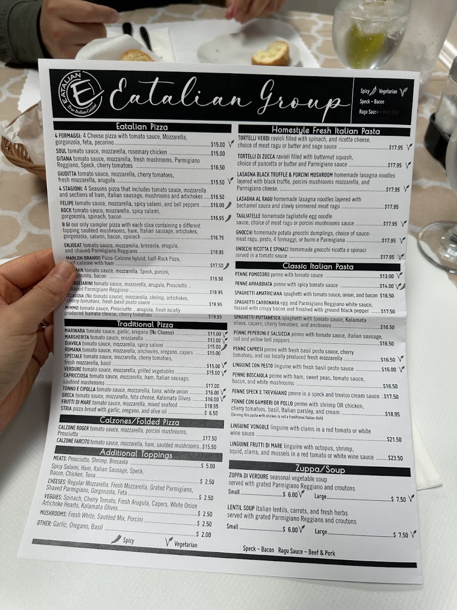Now, let’s talk about the star of the show: the food. Eatalian’s menu bursts with a variety of traditional Italian dishes, crafted from scratch with fresh ingredients that evoke the true essence of Italian cuisine. Start your meal with a comforting bowl of Zuppa Di Verdure, a seasonal vegetable soup enriched with grated Parmigiano Reggiano and crispy croutons—it's like hugging your favorite grandmother on a chilly day. If you're a fan of lentils, the Italian Lentil Soup is a delightful choice, filled with hearty flavors that warm your soul.